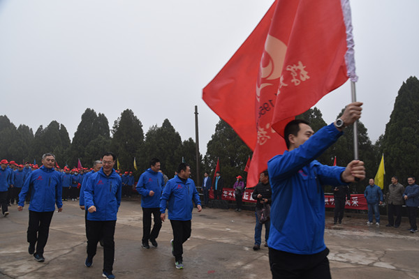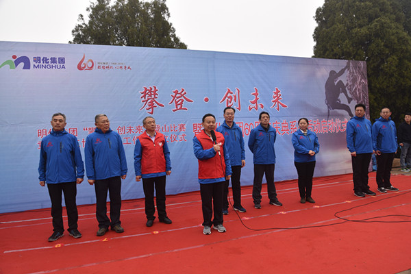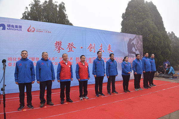 3月18日 9:18,明化集团“攀登·创未来”登山比赛、章丘义工协会明化工作站成立暨庆祝明化建企60周年系列活动启动仪式在章丘锦屏山风景区举行。章丘区总工会主席刘维圣、共青团章丘区委书记李敬、章丘宣传部副部长、章丘义工协会会长李永杰、章丘区人民医院常务副院长、义工协会秘书长陈锋,集团领导孙洪海、仇健、郭彦超、彭建军、孙志田,工会主席王廷波及各单位负责人、集团党委20个党支部160名参赛队员及部分明化义工参加启动仪式,集团党委副书记仇健主持仪式。