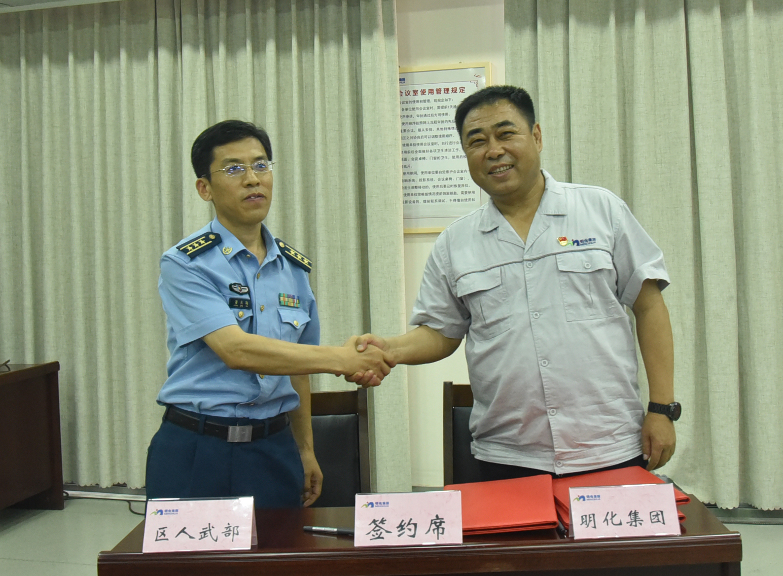绿树浓阴夏日长,军民共建强更强。7月26日下午,章丘区人武部与明化集团军民共建签约仪式在明化集团3#办公楼四楼会议室举行。区退役军人事务管理局局长傅长平、区人武部部长吴继鹏、政委董庆海、区退役军人事务管理局副局长邵玉河、区人武部军事科长饶金龙、政工科长李贝贝、集团董事长孙洪海、党委副书记仇健、副总经济师付安平、教育培训中心主任巩乃刚参加签约仪式。