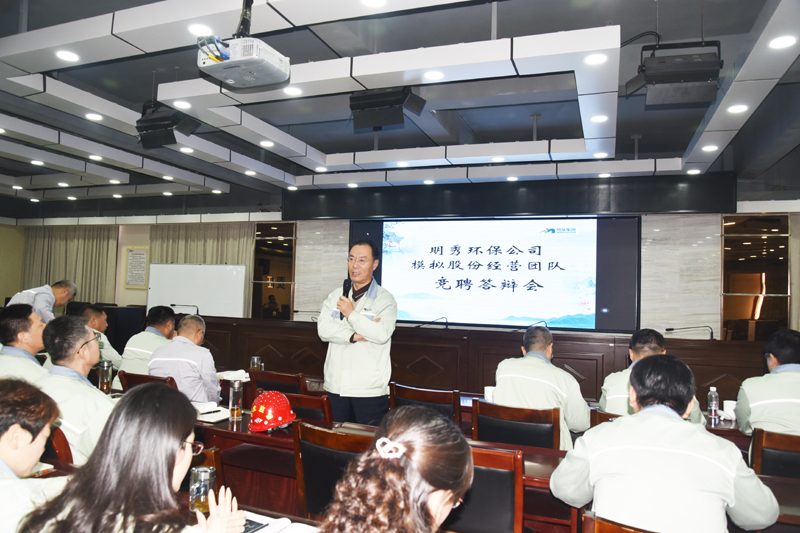 集团副总工程师王廷波宣读了明秀环保公司模拟股份经营团队竞聘办法,并对竞聘流程、计分办法做出详细解释。