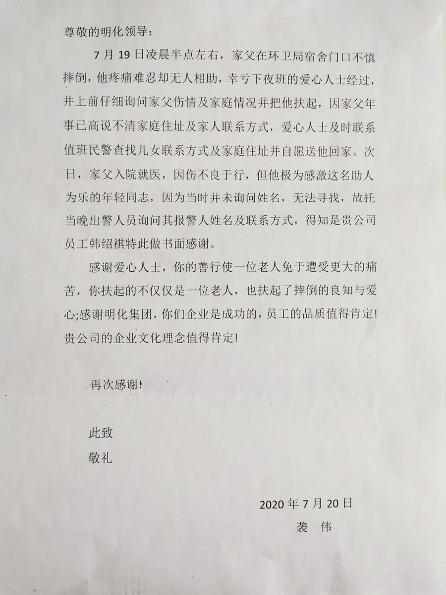 韩绍祺是明泉科技气化事业部的员工,是一位年轻的90后小伙。与他一起扶起老人的张衡也是明泉科技气化事业部的员工。二人岗位不同,性格各异,但却同样拥有一颗善良的心。他们的善心义举不仅帮助了老人,也传递了一份正能量,更向社会树起了一面爱心明泉的旗帜,就如感谢信中写到的“你扶起的不仅仅是一位老人,也扶起了良知与爱心”。感谢信的字里行间表达了老人一家对韩绍祺满满的谢意和诚挚的敬意,并对集团企业文化理念给予了高度赞扬。