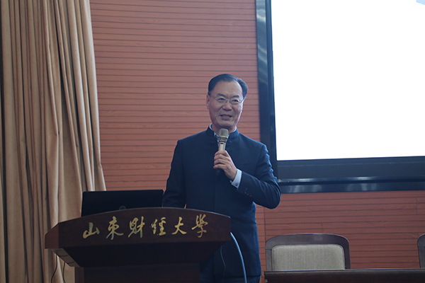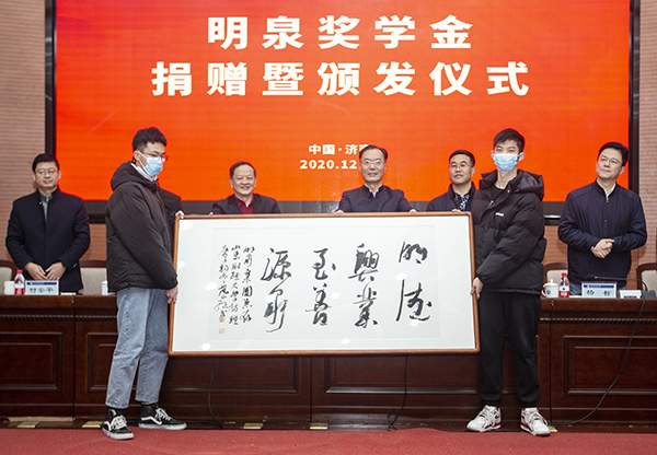 王廷波代表集团向山东财经大学捐赠奖学金,王剑宣读了“明泉奖学金”表彰决定,学校向集团赠送了山东财经大学艺术学院院长范正红的书法作品及奖杯,获奖学生代表向集团赠送了书法作品,获奖学生代表作了表态发言。