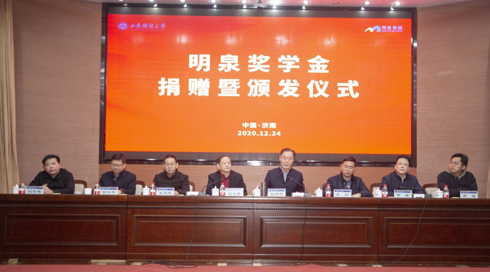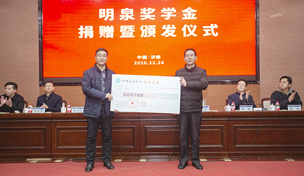 12月24日下午15:00,“明泉奖学金”捐赠暨颁发仪式在山东财经大学燕山校区图书馆报告厅举行,山东财经大学党委副书记赵友春、学生工作处处长王剑、就业指导处处长杨哲、合作发展处处长刘奇耀、团委书记张超,集团党委书记、董事长孙洪海,人力资源中心主任王廷波,薪酬绩效考核委副主任付安平,宣传部部长杨兴时,人力资源中心副主任宋敏等参加了仪式。