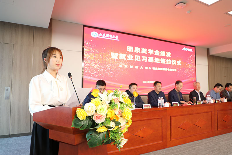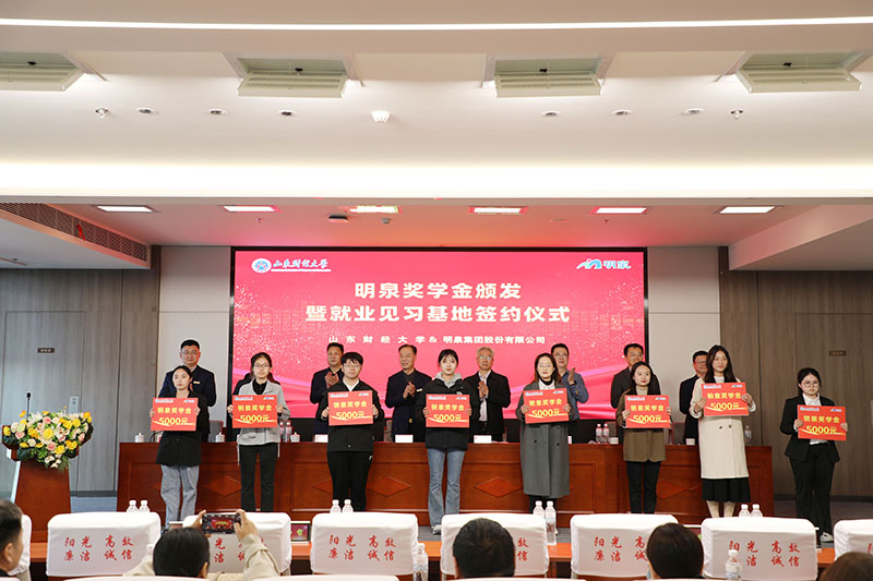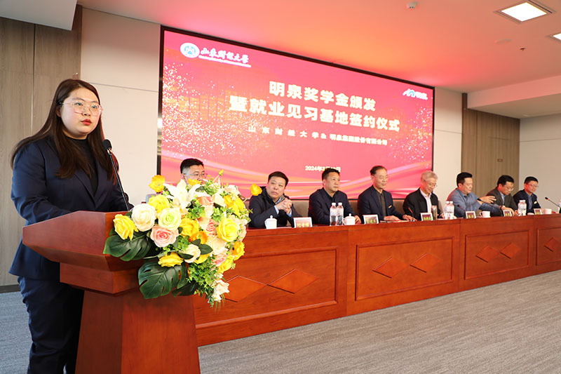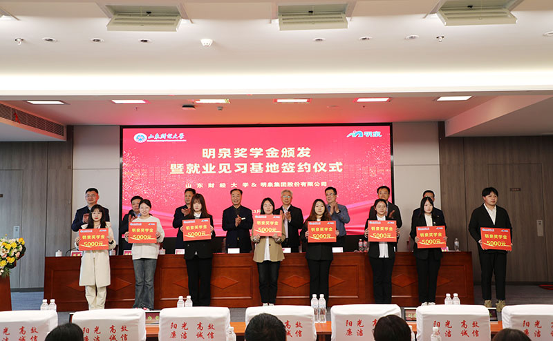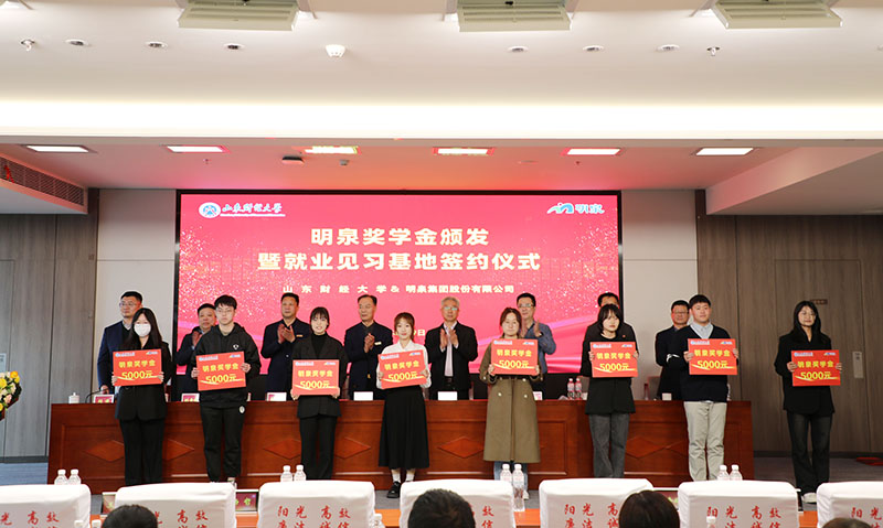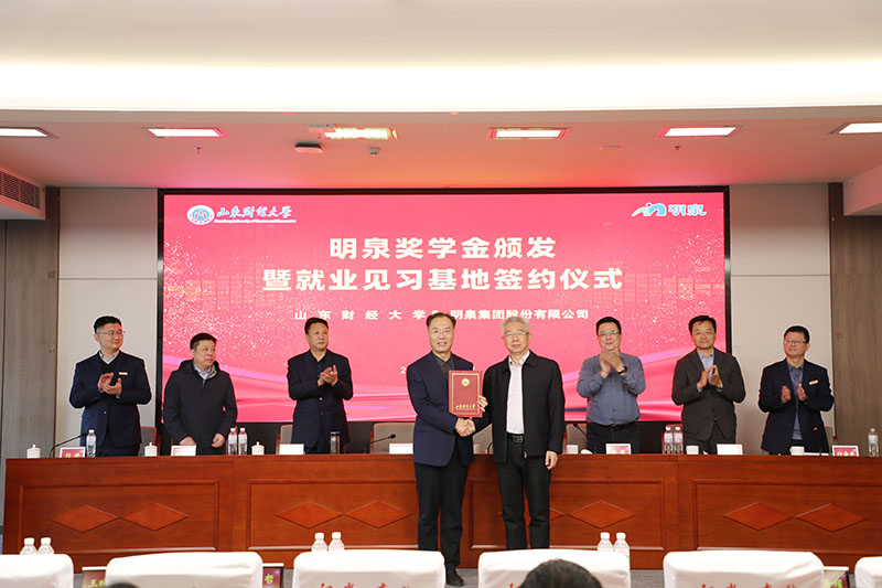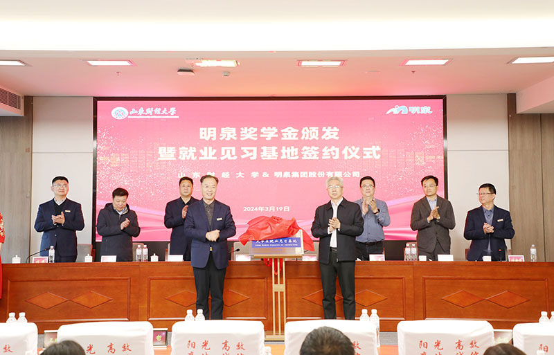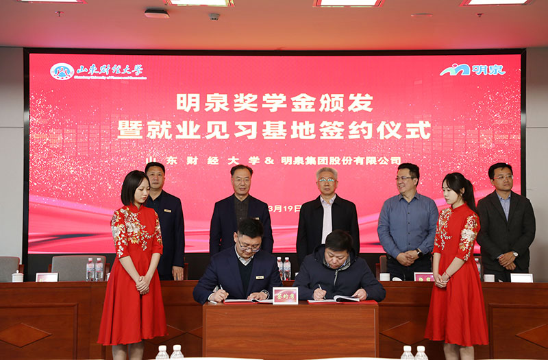 3月19日下午,“校企合作促发展,协同育人谱新篇”明泉奖学金颁发暨就业见习基地签约仪式在明泉大厦二楼多功能会议室举行。山东财经大学副校长张新、党委学生工作部部长杨哲、就业指导处处长刘奇耀、团委书记王晓迪,华球网页版党委书记、董事局主席孙洪海,党委副书记彭建军、人力资源中心主任刘洋、集团董事局办公室副主任付安平出席仪式。山东财经大学师生、明泉青年员工代表参加仪式。