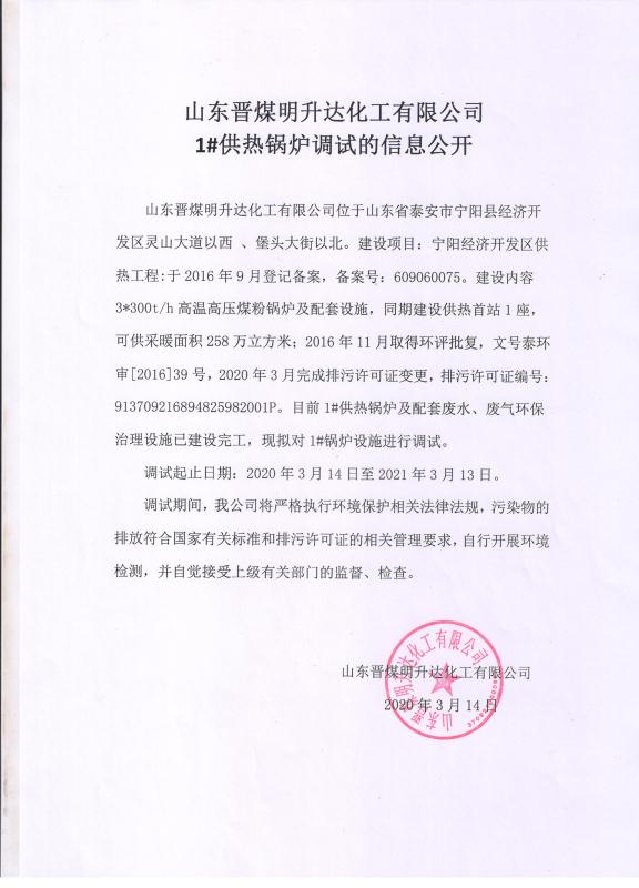 山东晋煤明升达化工有限公司1#供热锅炉调试的信息公开