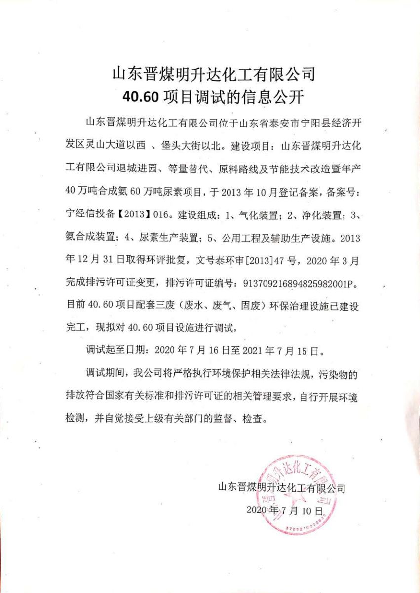 山东晋煤明升达化工有限公司40.60项目调试的信息公开